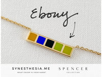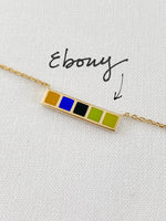 Customized name bar necklace for Ebony in hand-painted color enamel squares on a 18K Gold-plated over Silver bar. The matching vermeil chain is adjustable with loops at 16", 18", and 20".